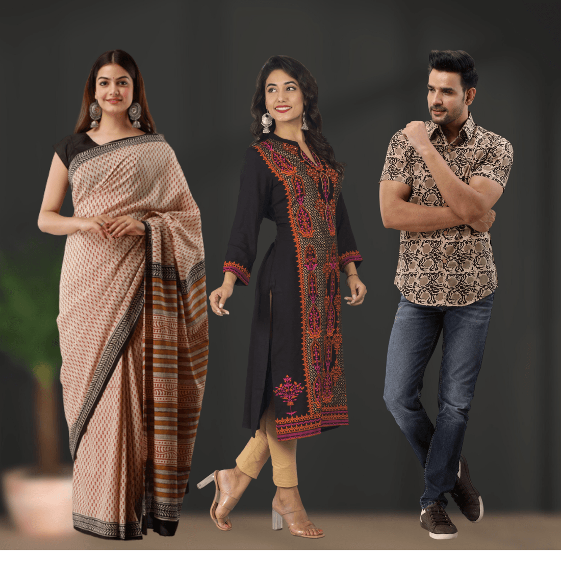 Cotton sarees are also popular among the masses. Small Motif Bagru Printed Cotton Saree, as the name suggests is a printed saree that can be worn for a regular office day or in the classroom. Bagru Sarees are made with 100% high-quality cotton and hard block printing by using natural dyes which provides these sarees a right balance between style and function. As it is with every other saree, you can style it in many ways.