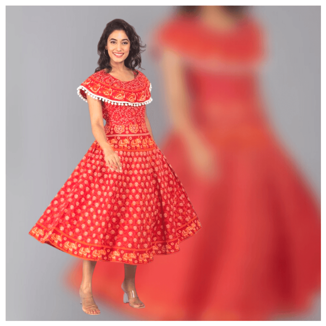 Similar design with a blue twist. They are also cotton made which gives them a high level of comfort due to their soft fabric. They are ideal to be rocked in a casual and party context. They have a blue background with different shades in floral patterns filling up the canvas. They are flared at the hem and also have red-colored pom-poms hanging at the yoke of the cloth.