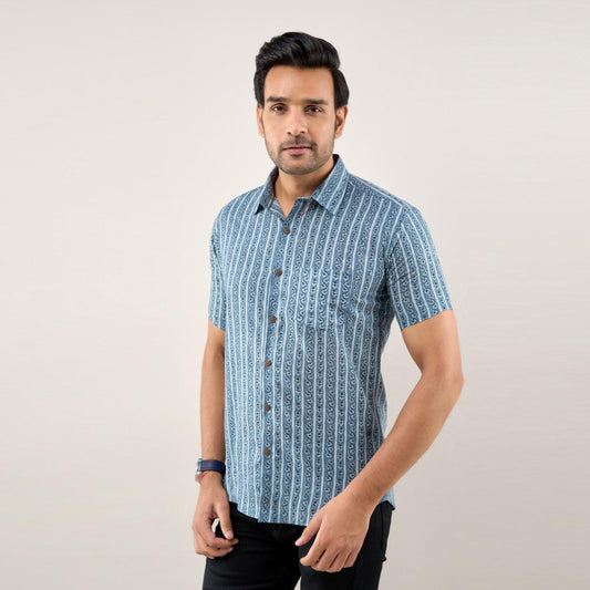 Men Navy Blue Ethnic Printed Short Sleeves Casual Cotton Shirt