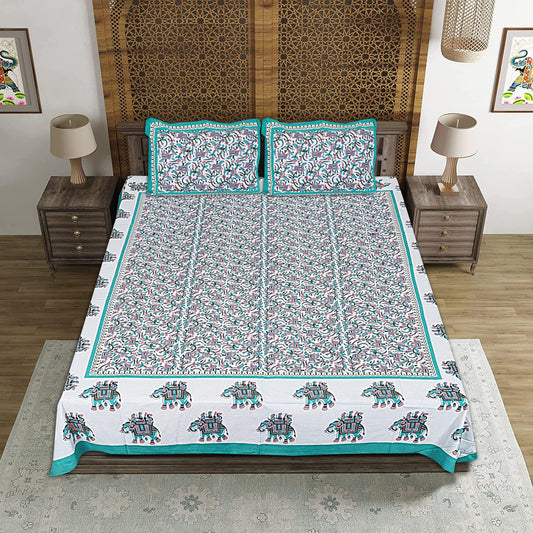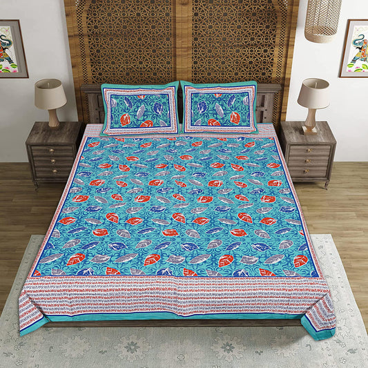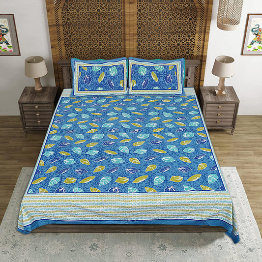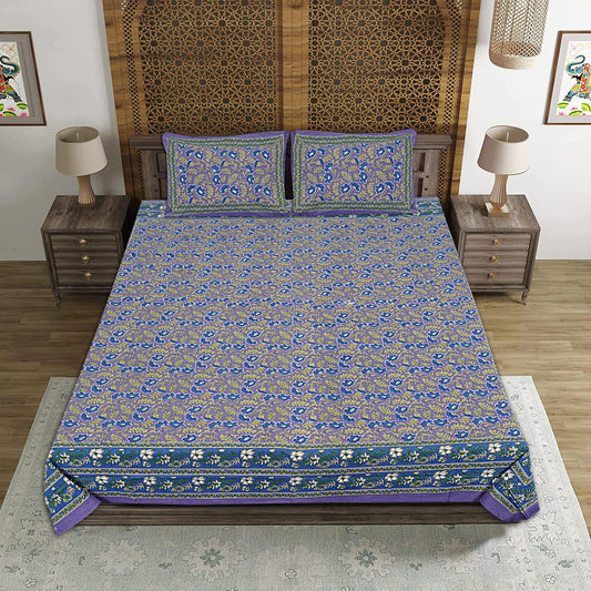 Blue Cotton 240 TC Jaipuri Print Double Bedsheet With 2 Pillow Covers (ADB1388)