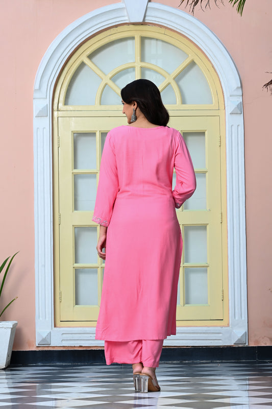 Taffy Pink Embroidered Mirror Work Rayon Kurta with Palazzo