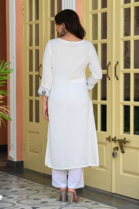 White & Black Floral Embroidered Rayon Kurta with Trousers & Organza Dupatta