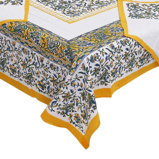 Yellow Pure Hand Block Printed 240 TC Cotton Table Cover with 6 Napkins (SHKF1003)