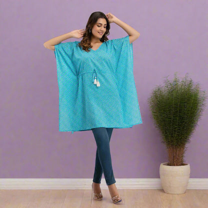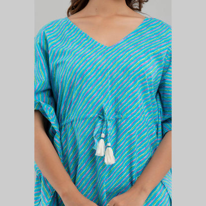 Add this stylish kaftan dress in your wardrobe to stand out and let your outfit speak for you. Stride in perfection and make a fashion statement with this flowy contemporary kaftan dress, amped up with pleasant ethnic print design, V neck, kimono sleeves, drawstring waist tie-up, and graceful appeal. You'll love the sophistication of the print and softness of this fabric. Comfy and stylish in equal parts, this ensemble is a soothing hued beauty. Be it for weddings or dinners, reunions or nightouts, our collection of trendy leheriya print jaipuri Kaftan Dresses is ideal for all occasions. Swing by our collection and add a fun flare to any outfit.