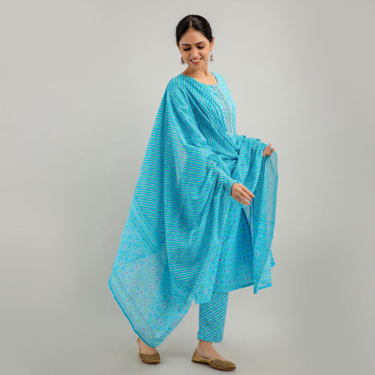 Sky Blue Bandhani Print with Yoke Design A-Line Kurta with Trousers & Dupatta