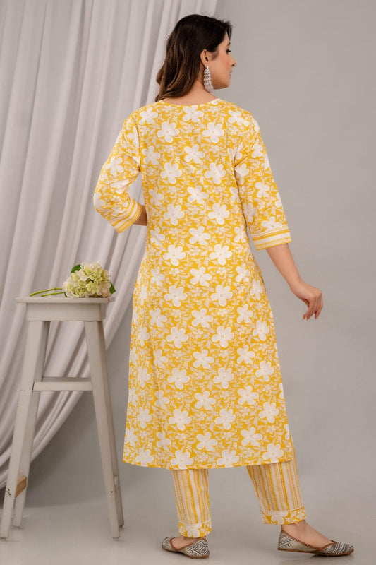 Yellow Floral Print with Yoke Design Straight Kurta with Trousers & Dupatta