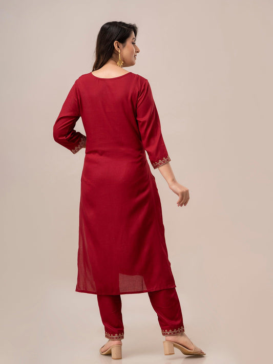 Women Red Sequinned Yoke Design Kurta with Trousers