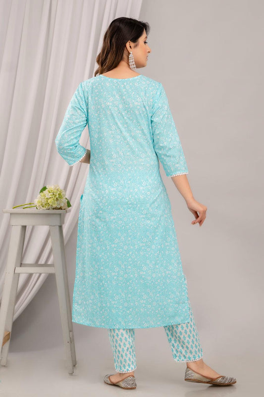 Light Blue Floral Print with Yoke Design Straight Kurta with Trousers & Dupatta
