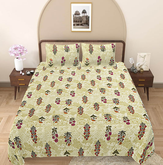 Green Floral 240 TC Cotton 1 King Bedsheet with 2 Pillow Covers (ADB1495)