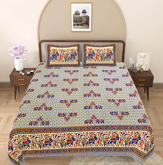 Blue & Brown Ethnic Motifs 240 TC Cotton 1 Super King Bedsheet with 2 Pillow Covers (SHKV1073)