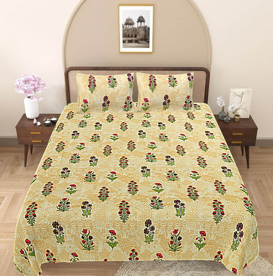 Beige & Green Floral 240 TC Cotton 1 Super King Bedsheet with 2 Pillow Covers (SHKV1075)
