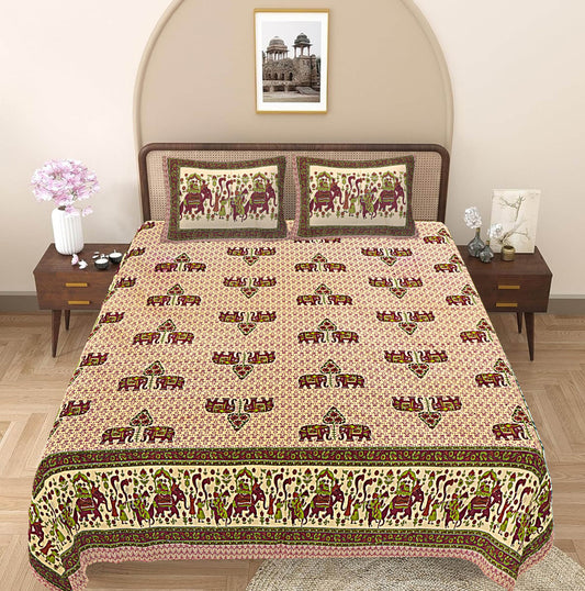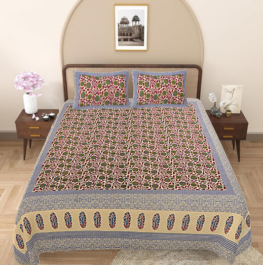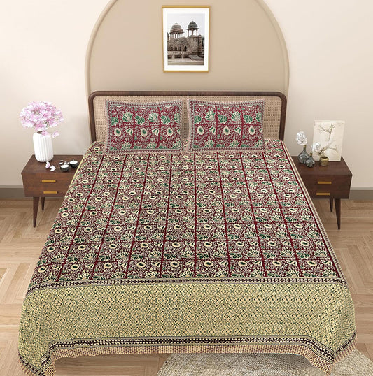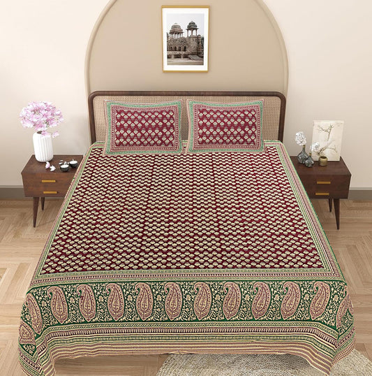Green & Maroon Ethnic Motifs 240 TC Cotton 1 Super King Bedsheet with 2 Pillow Covers (SHKV1072)
