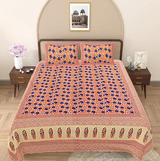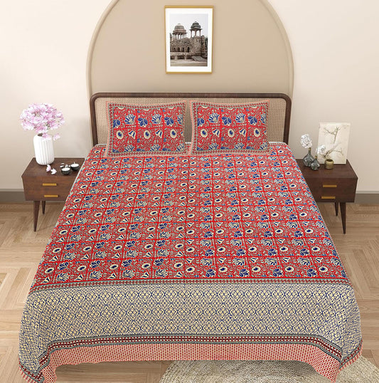 Blue & Red Ethnic Motifs 240 TC Cotton 1 Super King Bedsheet with 2 Pillow Covers (SHKV1071)