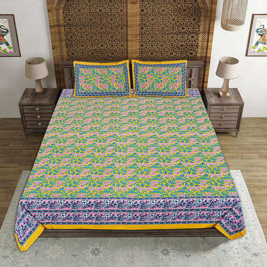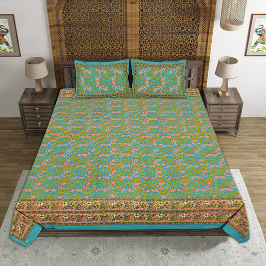 Green Cotton 240 TC Jaipuri Print Double Bedsheet With 2 Pillow Covers (ADB1384)