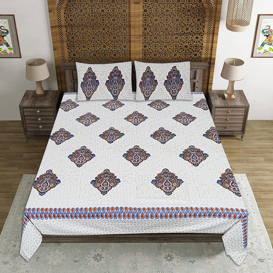 White Cotton 240 TC Jaipuri Print Double Bedsheet With 2 Pillow Covers (ADB1389)