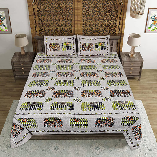 Grey Cotton 240 TC Jaipuri Print Double Bedsheet With 2 Pillow Covers (ADB1382)