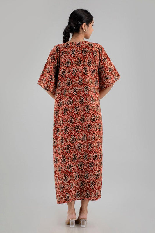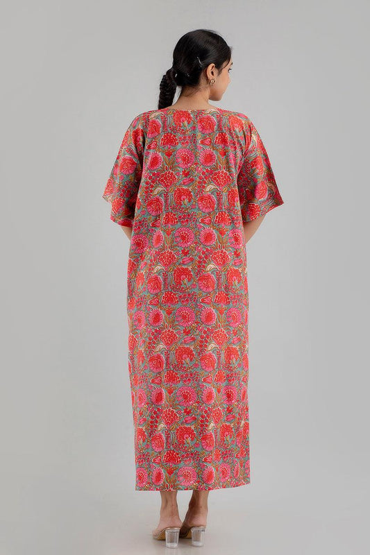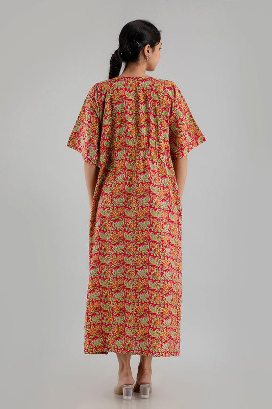 Red Floral Print Pure Cotton Kaftan Maxi Ethnic Dress - SHKUP1243
