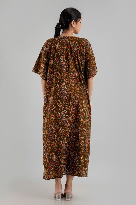 Dark Green Floral Print Pure Cotton Kaftan Maxi Ethnic Dress - SHKUP1246