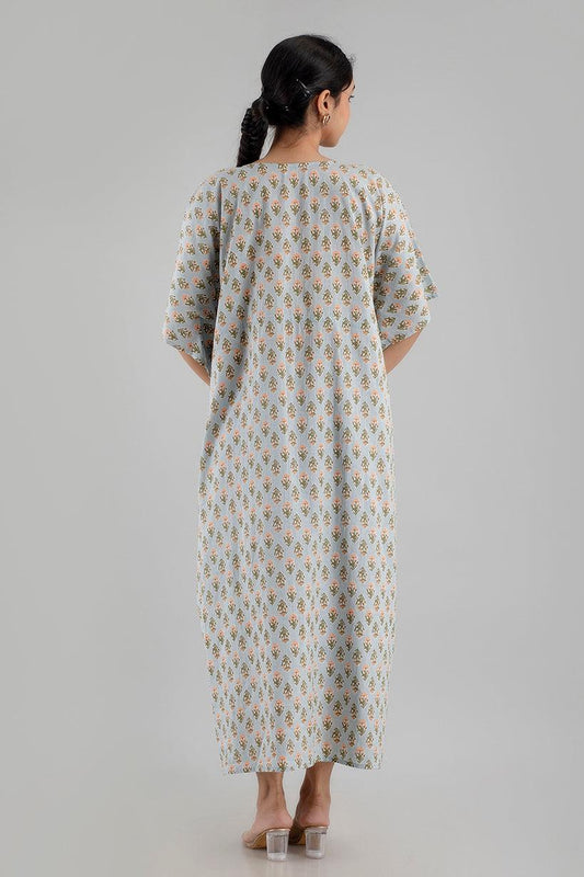 Grey Floral Print Pure Cotton Kaftan Maxi Ethnic Dress - SHKUP1247