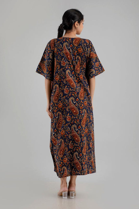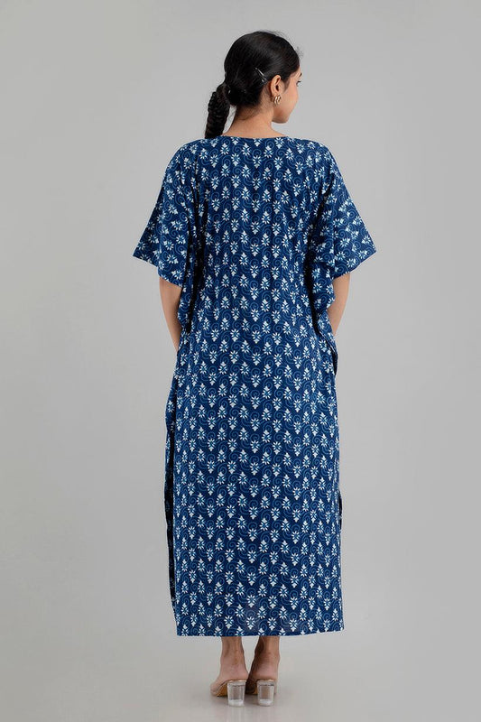 Dark Blue Floral Print Pure Cotton Kaftan Maxi Ethnic Dress - SHKUP1248