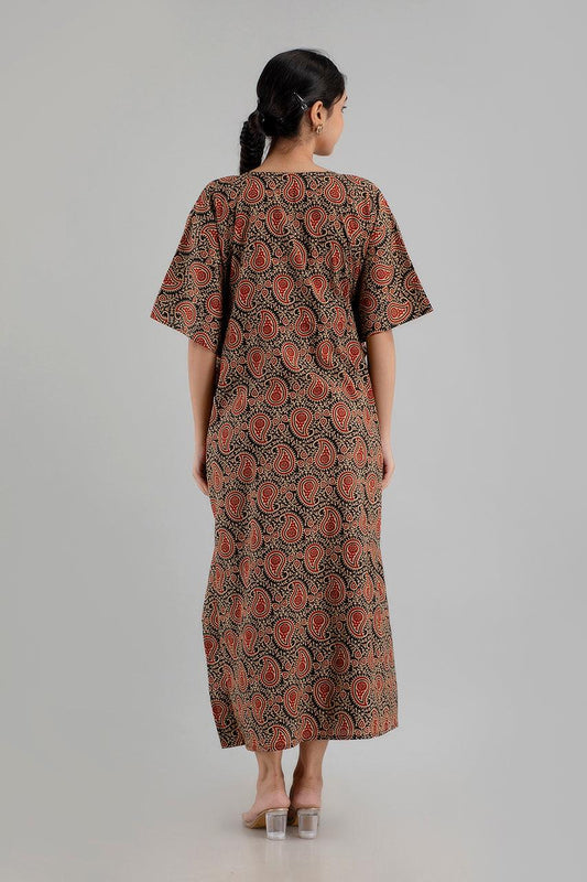 Black Floral Print Pure Cotton Kaftan Maxi Ethnic Dress - SHKUP1250