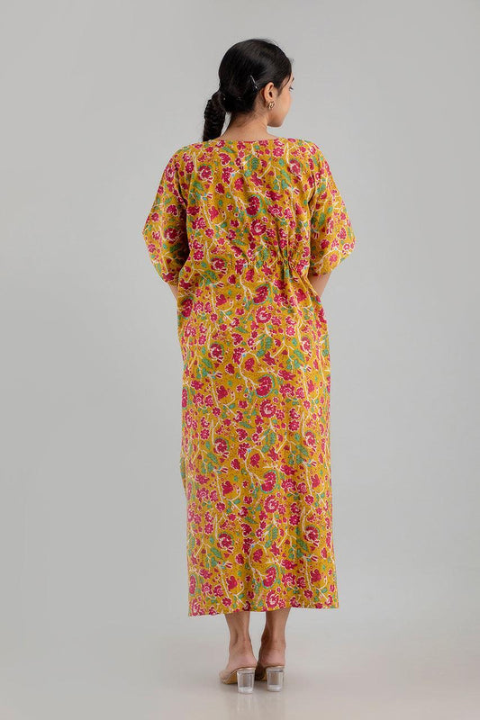 Yellow Floral Print Pure Cotton Kaftan Maxi Ethnic Dress - SHKUP1251