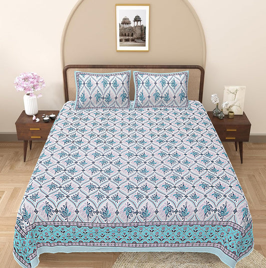 Turquoise Blue Floral Printed Double Bedsheet With 2 Pillow Covers (ADB1473)
