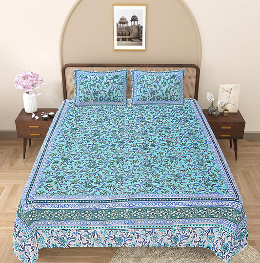 Turquoise Blue Floral Printed Double Bedsheet With 2 Pillow Covers (ADB1460)