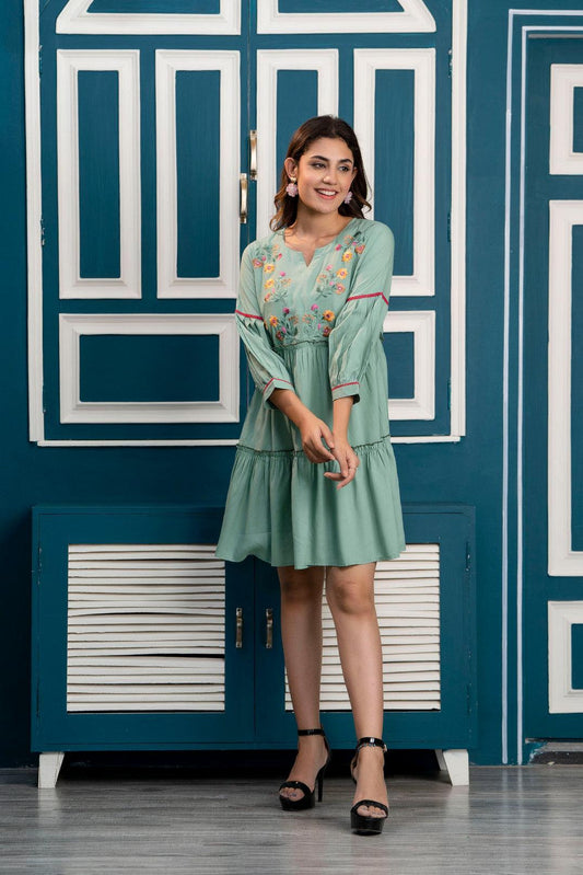 Pista Green Embroidered Mini Fit and Flare Dress