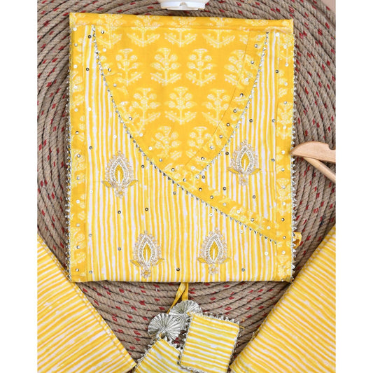 Traditional Screen Print Cotton Unstitched Suit With Cotton Dupatta (Yellow-SHKS1102)