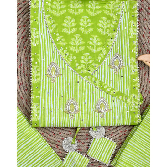 Traditional Screen Print Cotton Unstitched Suit With Cotton Dupatta (Green-SHKS1104)