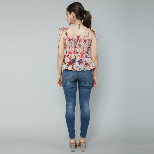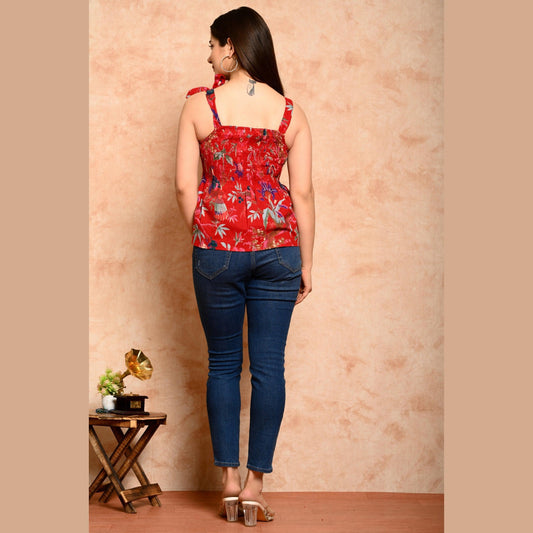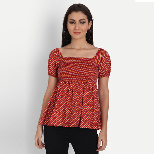 Aqua Blue Cotton Ethnic Print Smocked Top