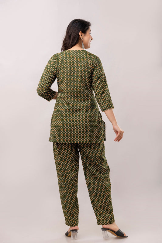 Seaweed Green Floral Printed Mirror Work Pure Cotton V Neck Top With Trouser