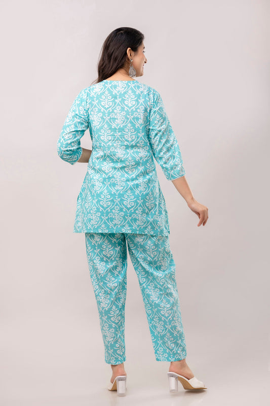 Turquoise Blue Floral Printed Mirror Work Pure Cotton V Neck Top With Trouser