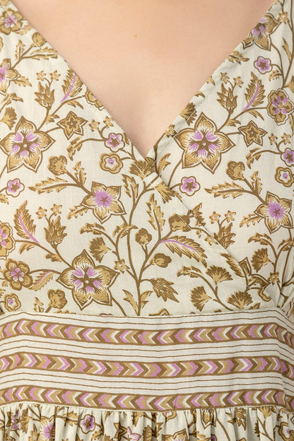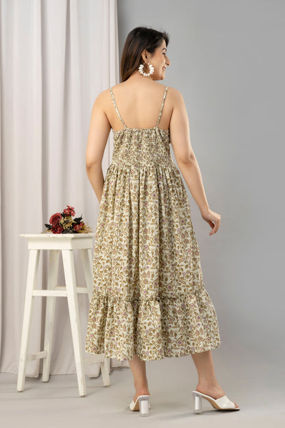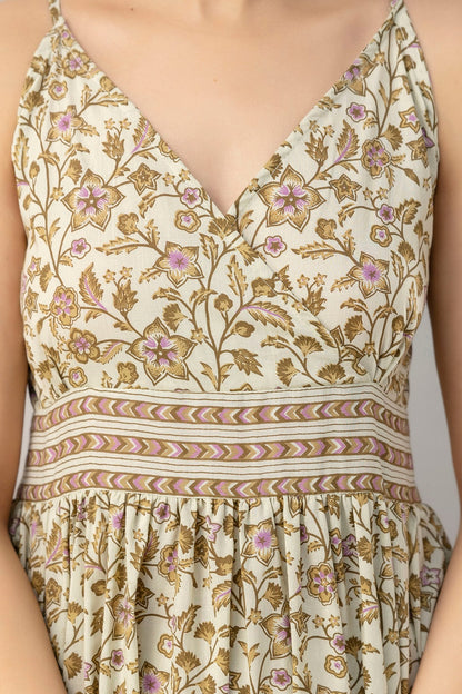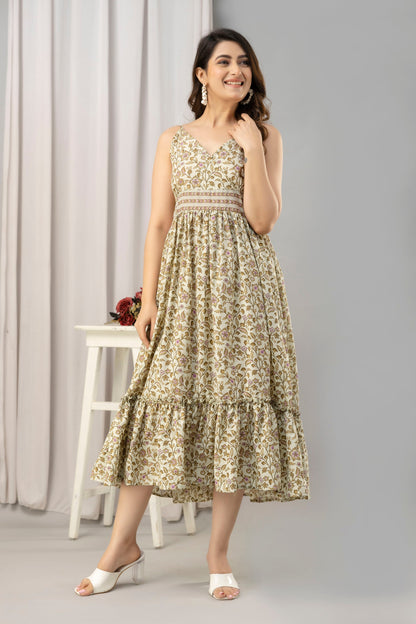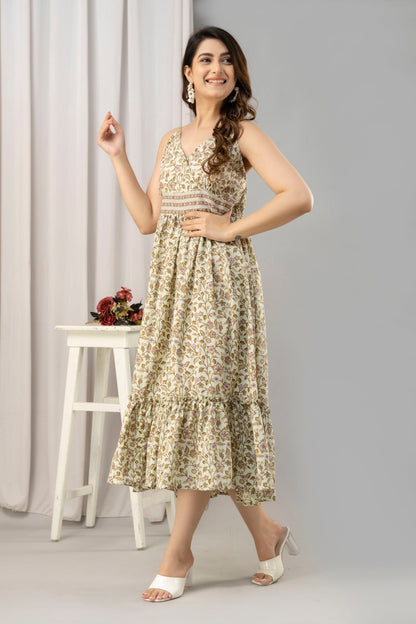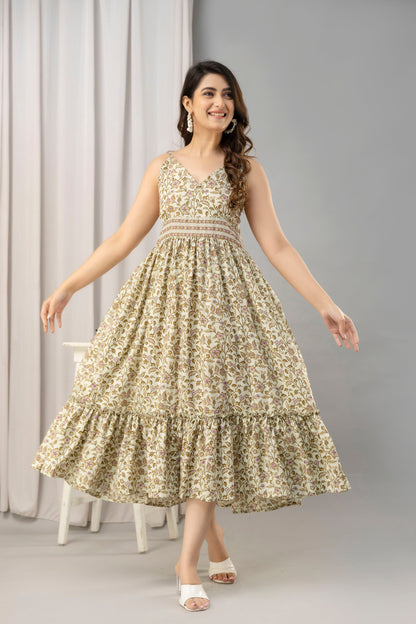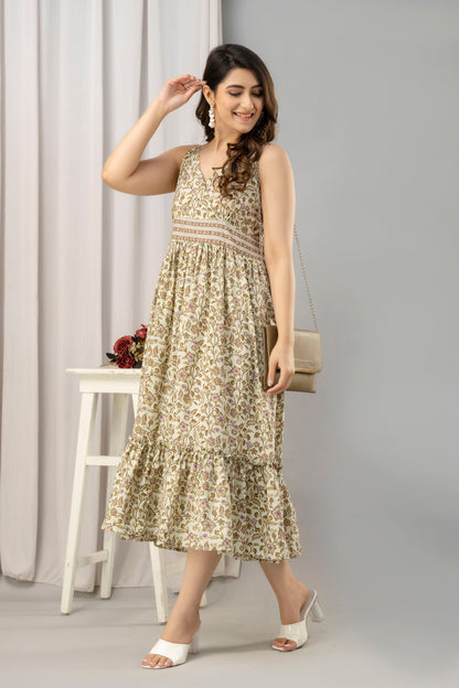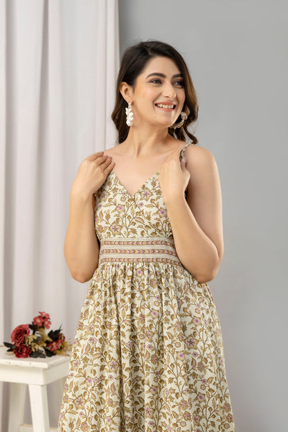 Beige Floral Printed Sleeveless Fit and Flare Maxi Dress - SHKUP1447