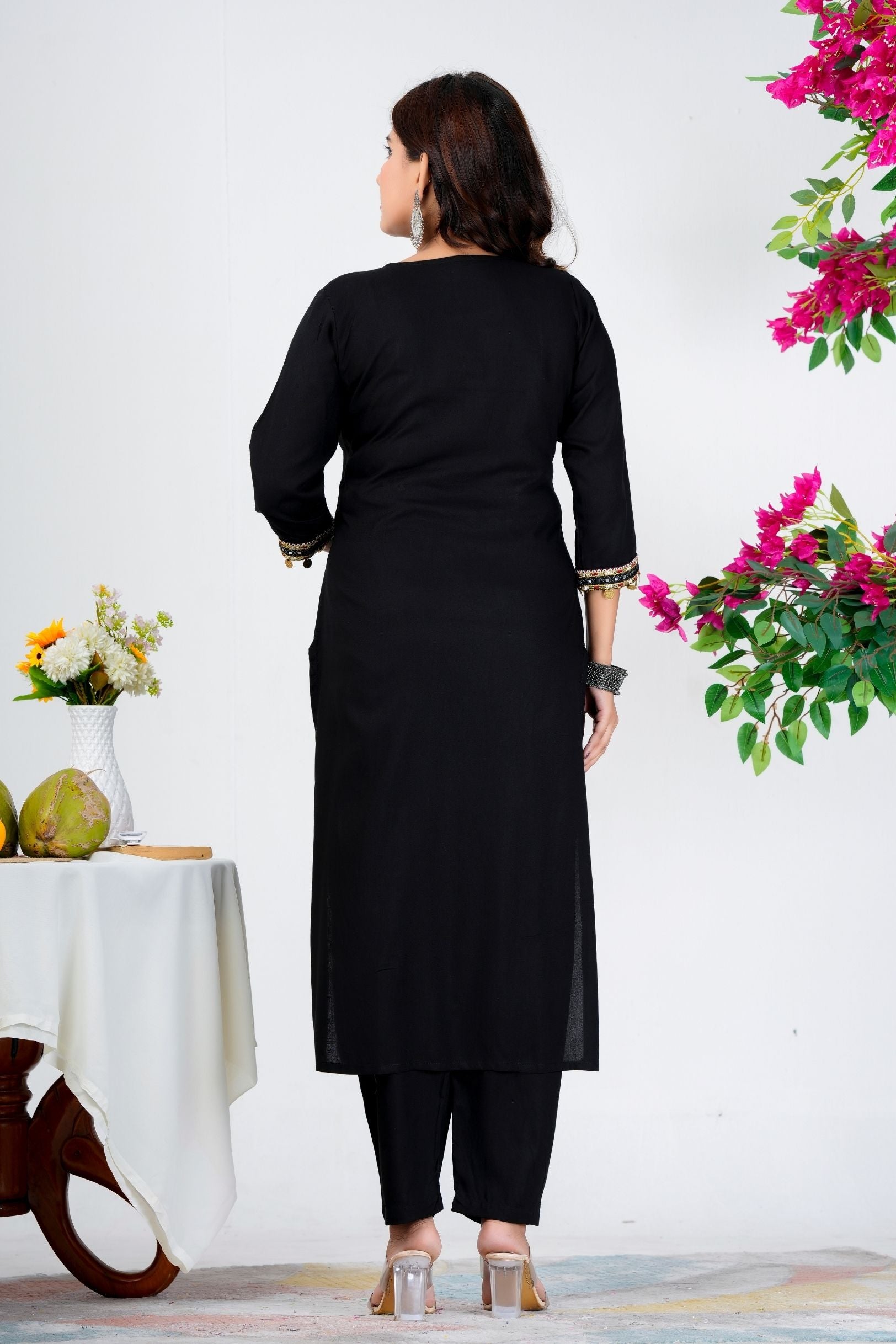 - Kurta: Straight cut with detailed embroidery, mirror work, and tassel accents