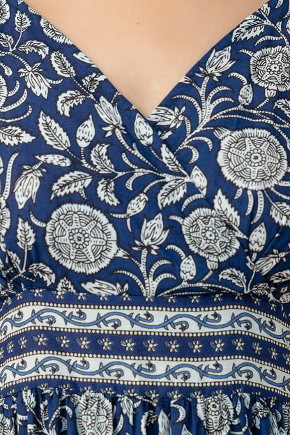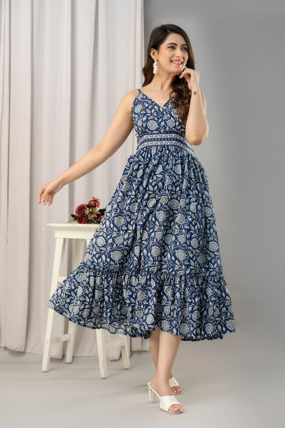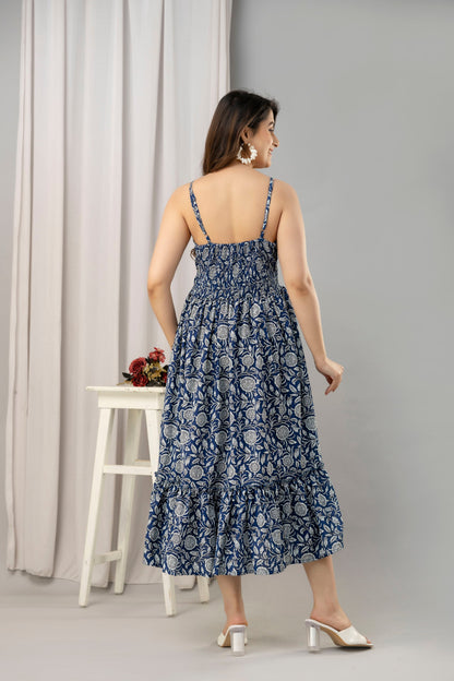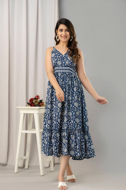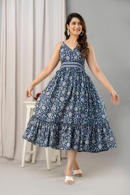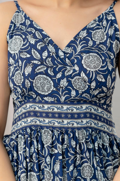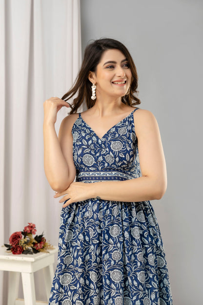 Blue Floral Printed Sleeveless Fit and Flare Maxi Dress - SHKUP1444