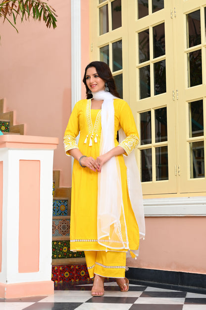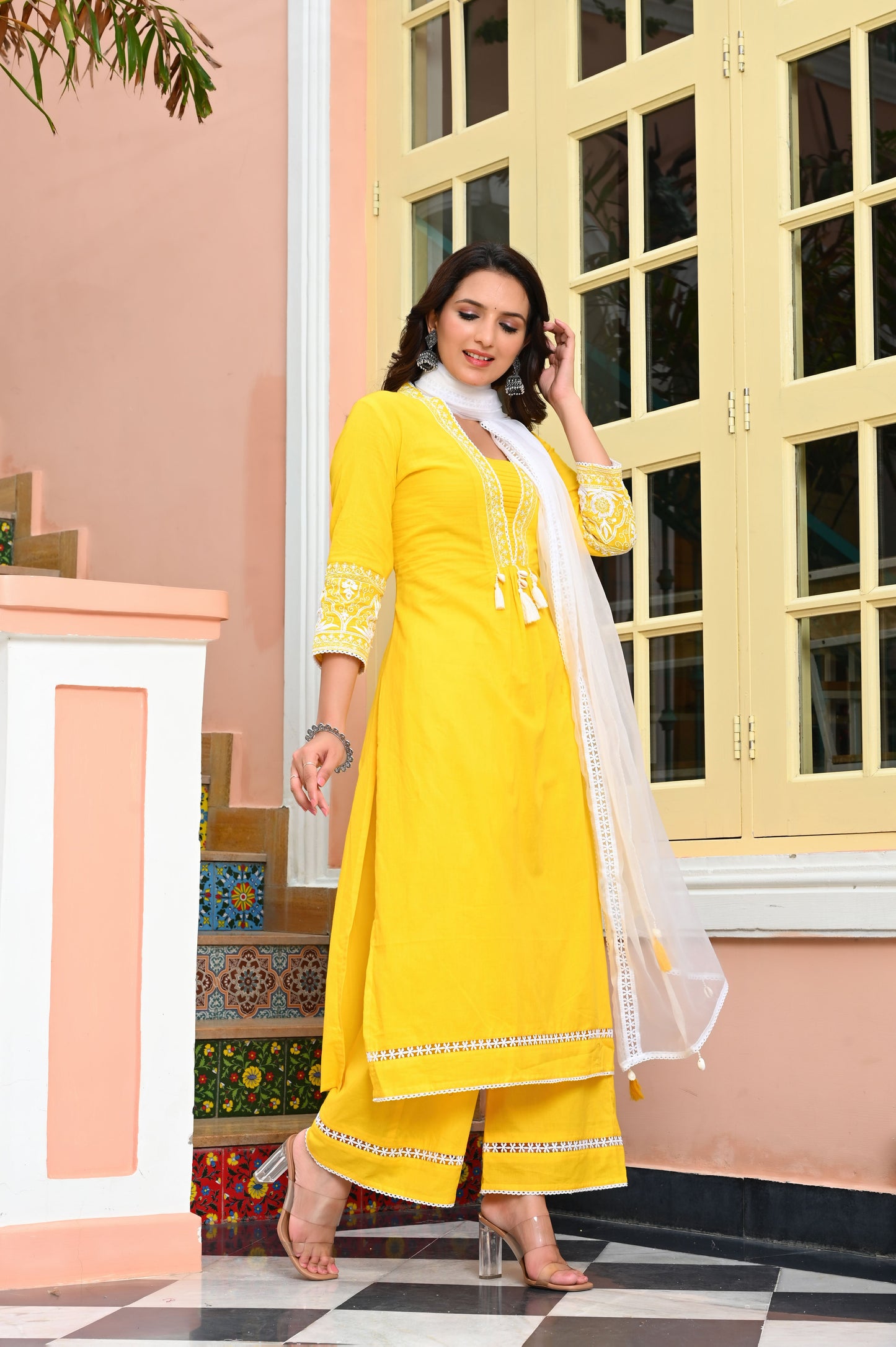 Charming Yellow Embroidered Pure Cotton Kurta with Palazzo & Organza Dupatta