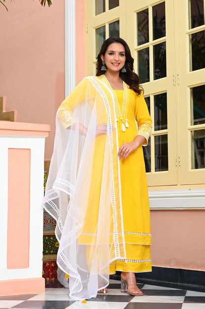 Yellow Embroidered Pure Cotton Kurta with Palazzo & Organza Dupatta