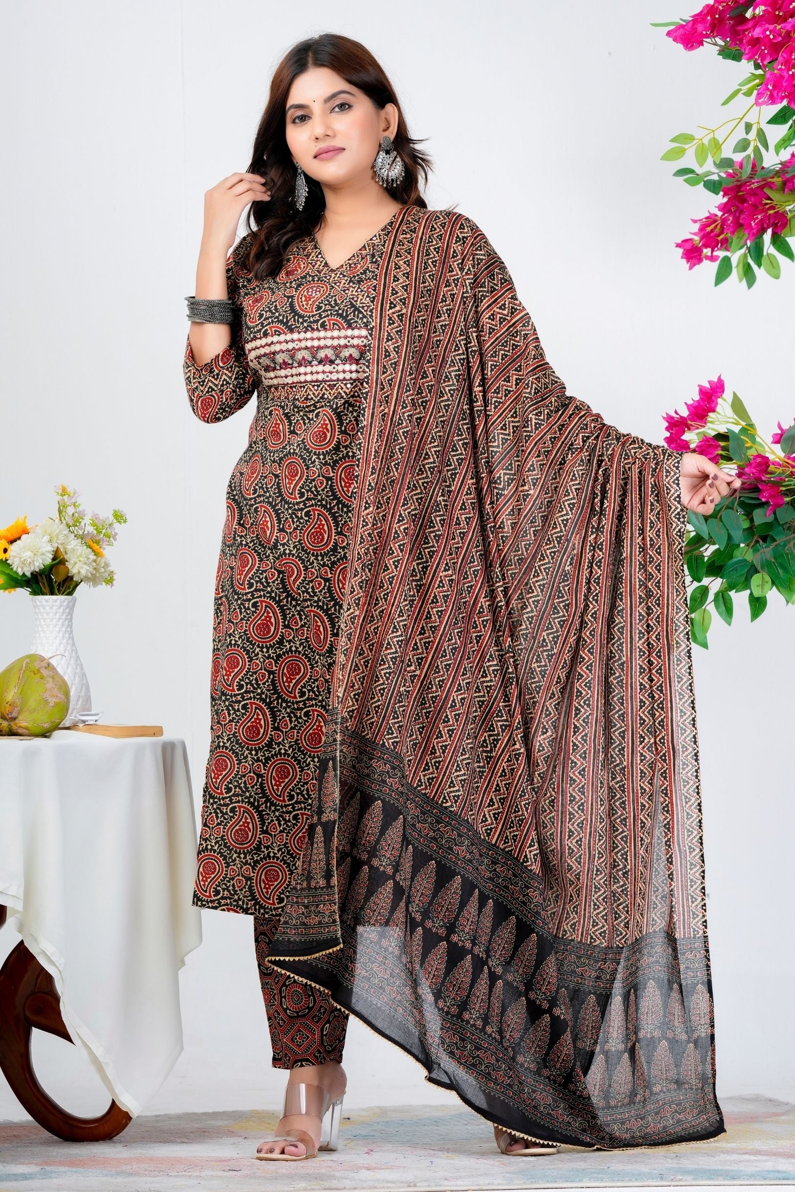 Enhance your ethnic style with this timeless black and red kurta set. Featuring traditional paisley prints, intricate detailing on the yoke, and a beautifully patterned dupatta, this ensemble blends comfort with elegance—perfect for festive gatherings, office wear, and casual outings.