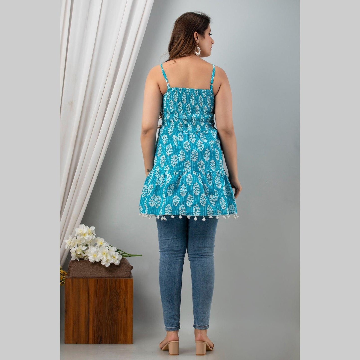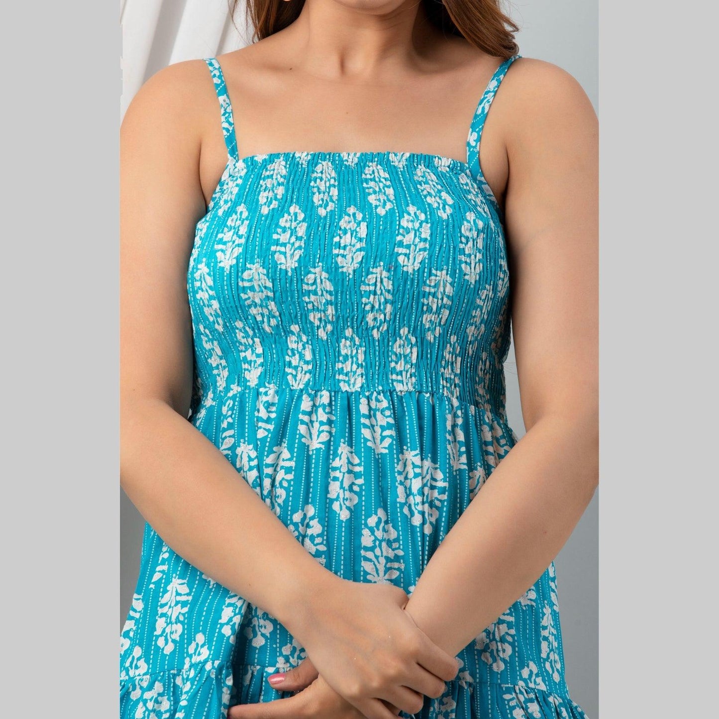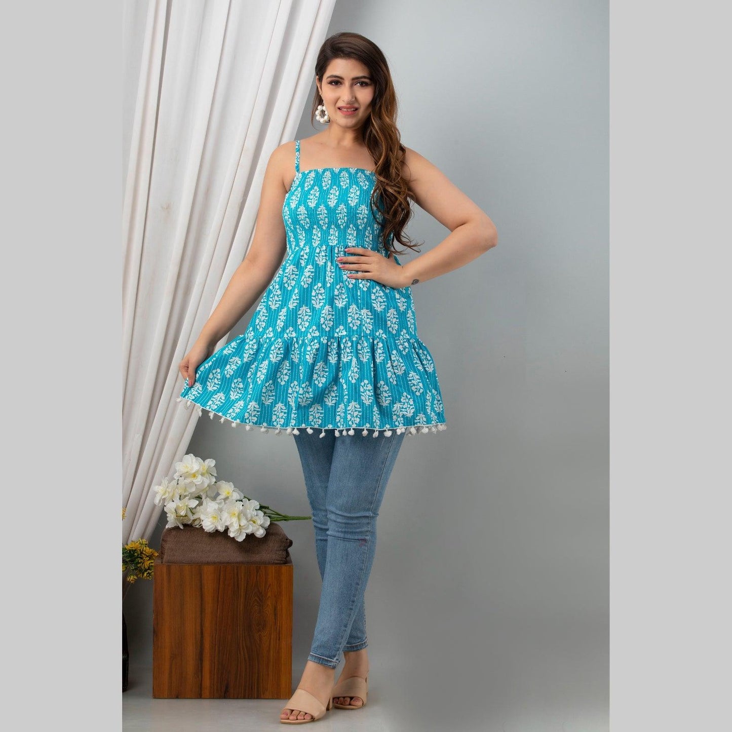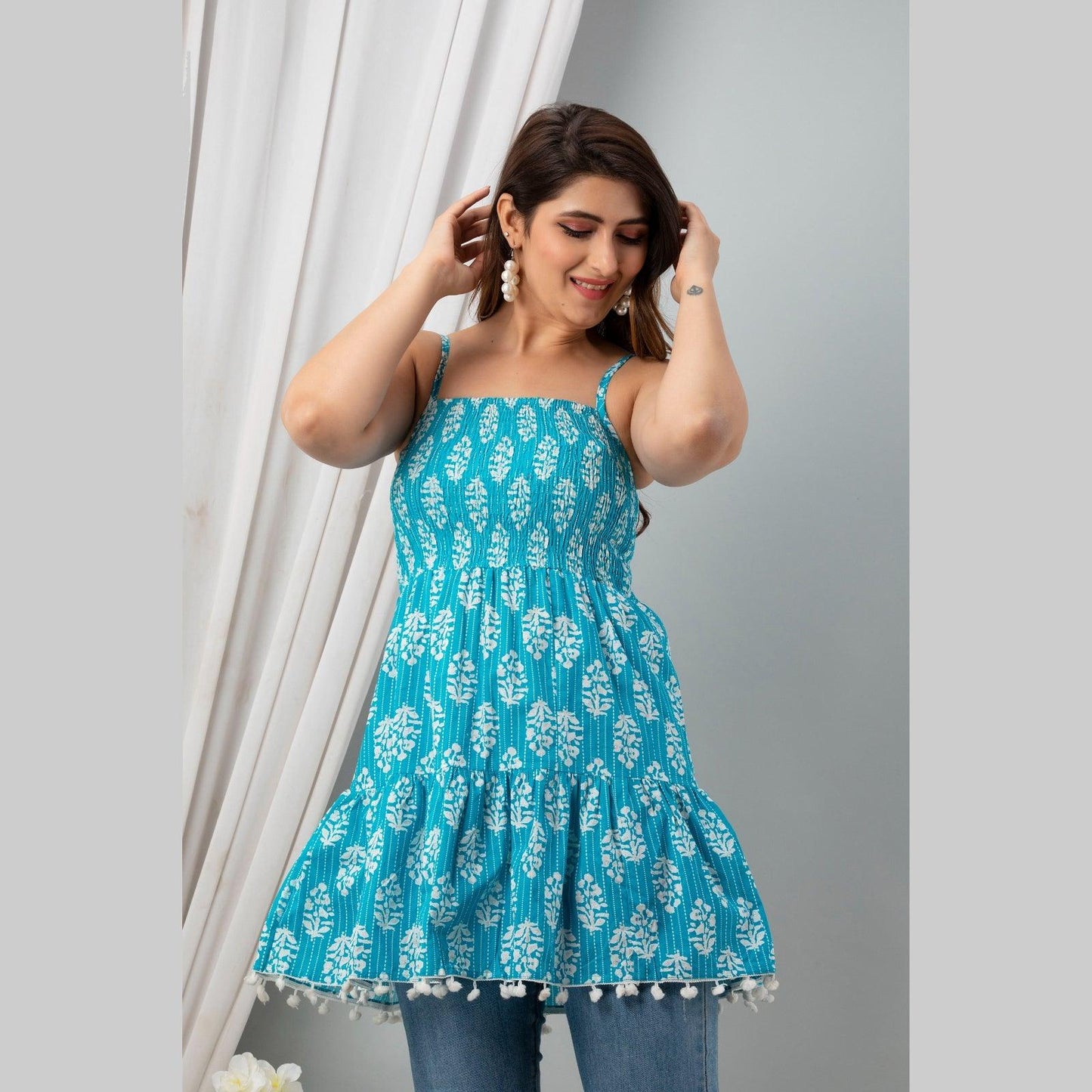 This aqua blue ethnic printed smocked detailing top is a must-have style for the summer season. Tailored with a square neck, it features sleeveless, shoulder strapes, tiered hemline with pom pom detailing .