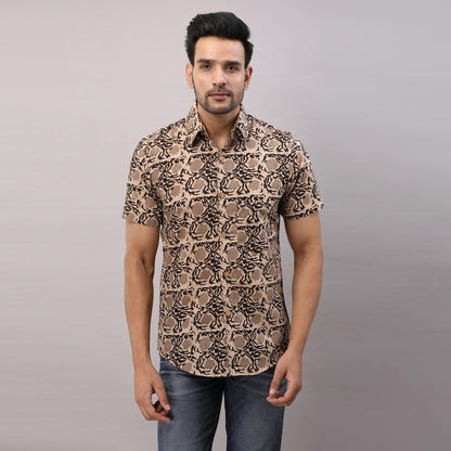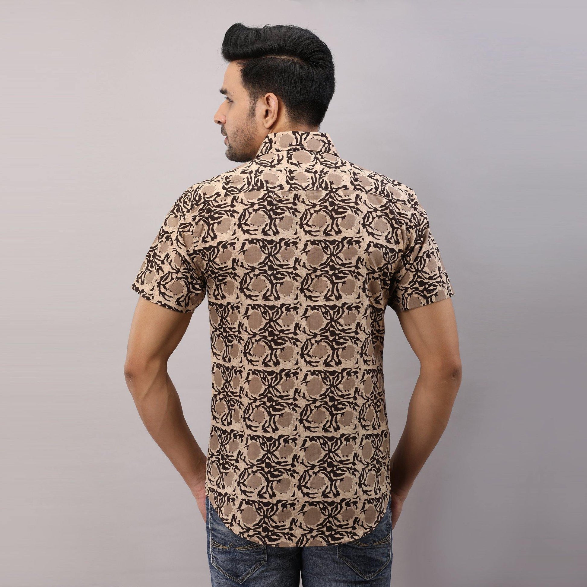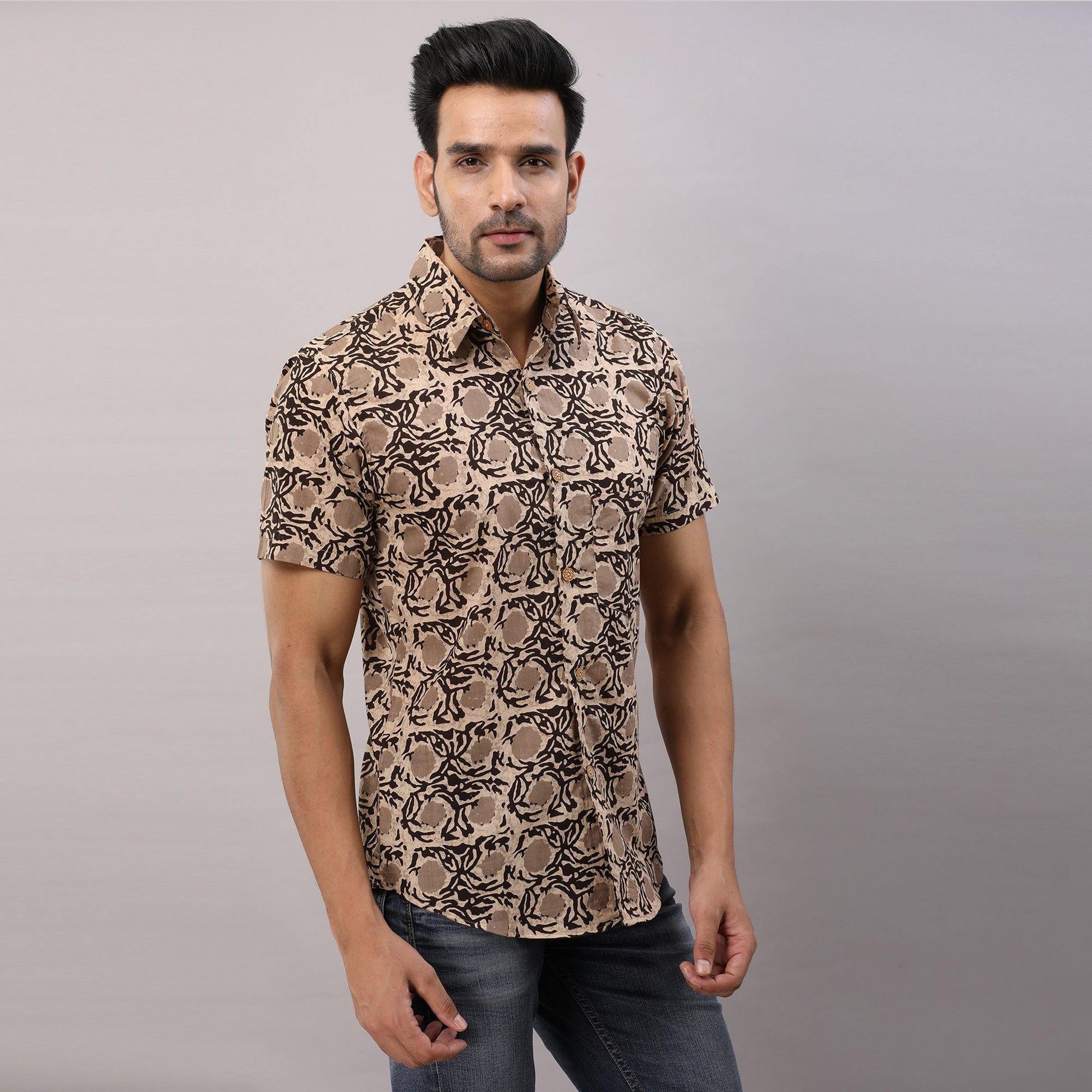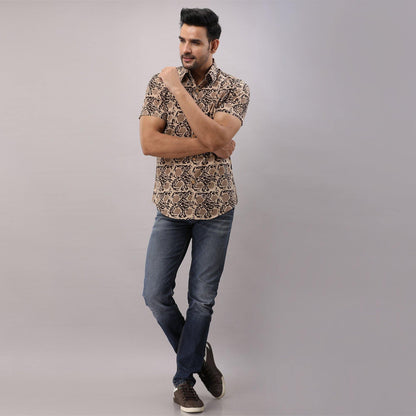 This comfortable half-sleeved block printed shirt is any wearer's favorite. Crafted in breathable pure cotton, prints are made from vegetable dye, it is fashioned to create a sophisticated impression with its smart regular collar and hand block printed design.