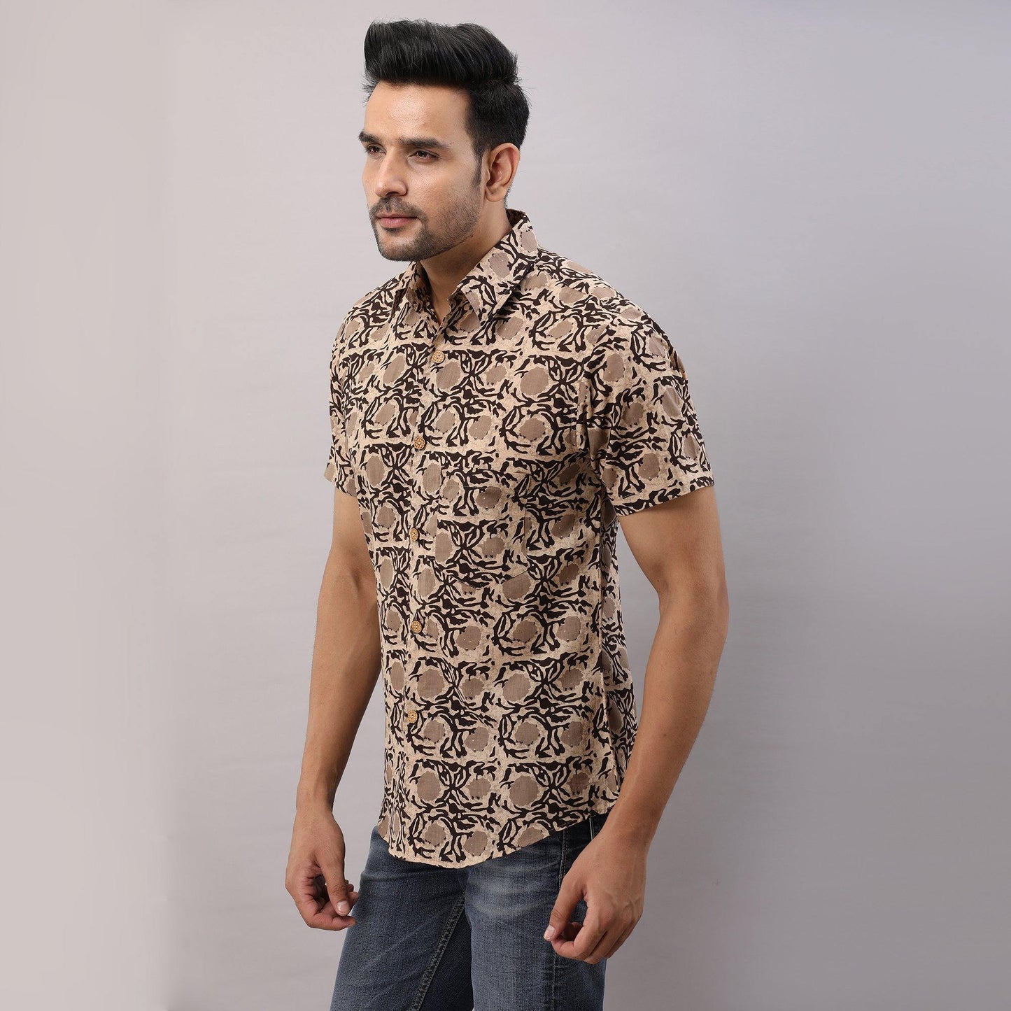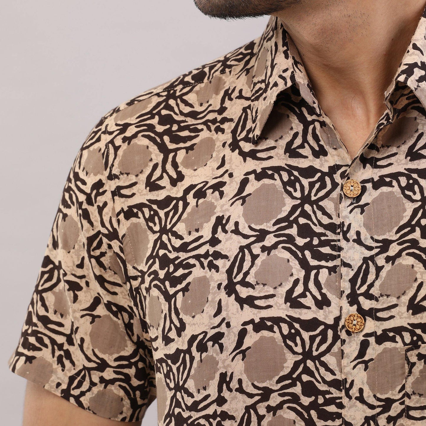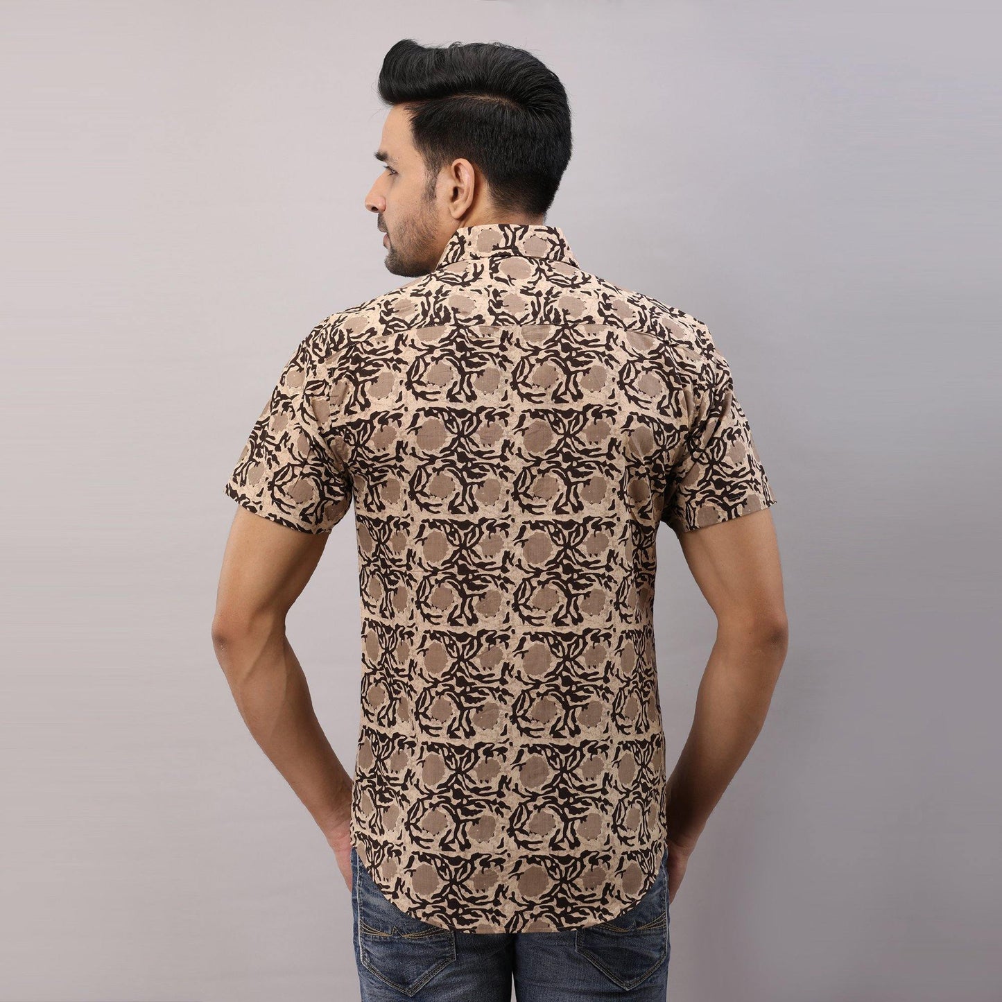 This comfortable half-sleeved block printed shirt is any wearer's favorite. Crafted in breathable pure cotton, prints are made from vegetable dye, it is fashioned to create a sophisticated impression with its smart regular collar and hand block printed design.