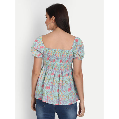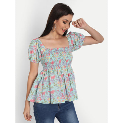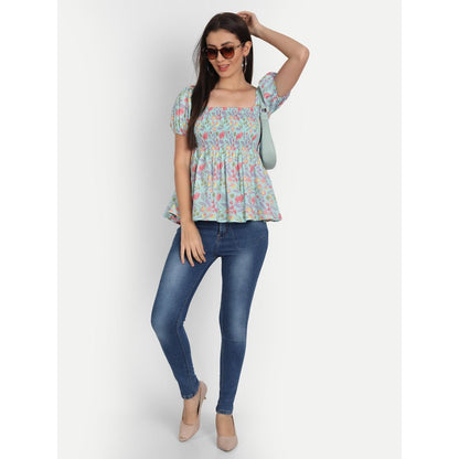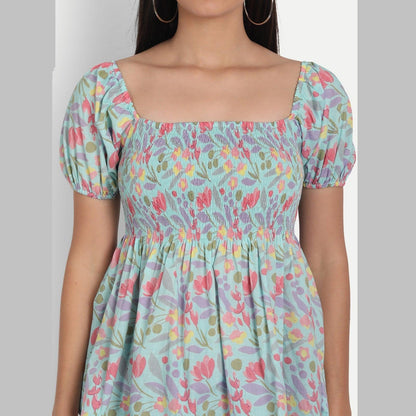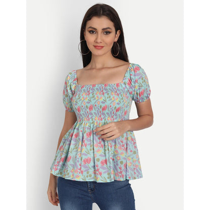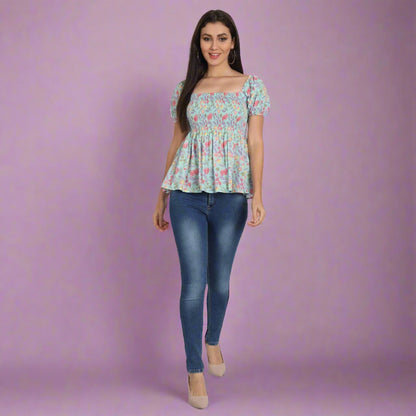 This light blue floral printed smocked detailing top is a must-have style for the summer season. Tailored with a square neck, it features half sleeves, and flared hem.