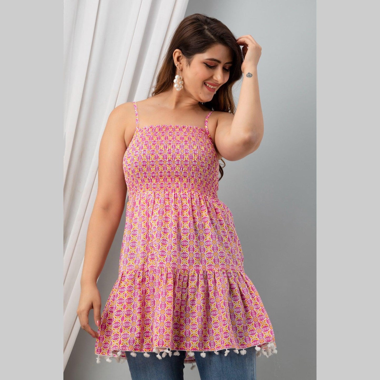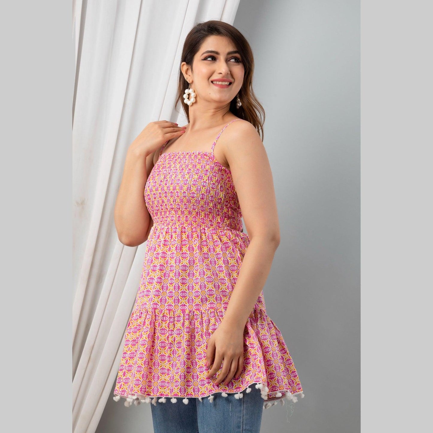 This pink ethnic printed smocked detailing top is a must-have style for the summer season. Tailored with a square neck, it features sleeveless, shoulder strapes, tiered hemline with pom pom detailing .