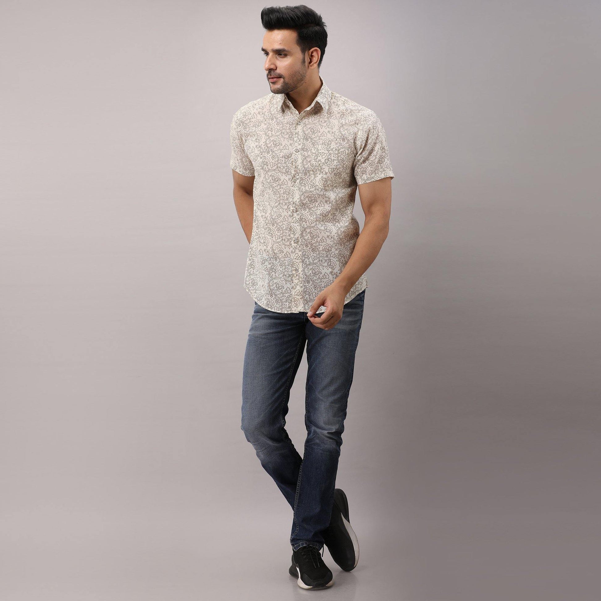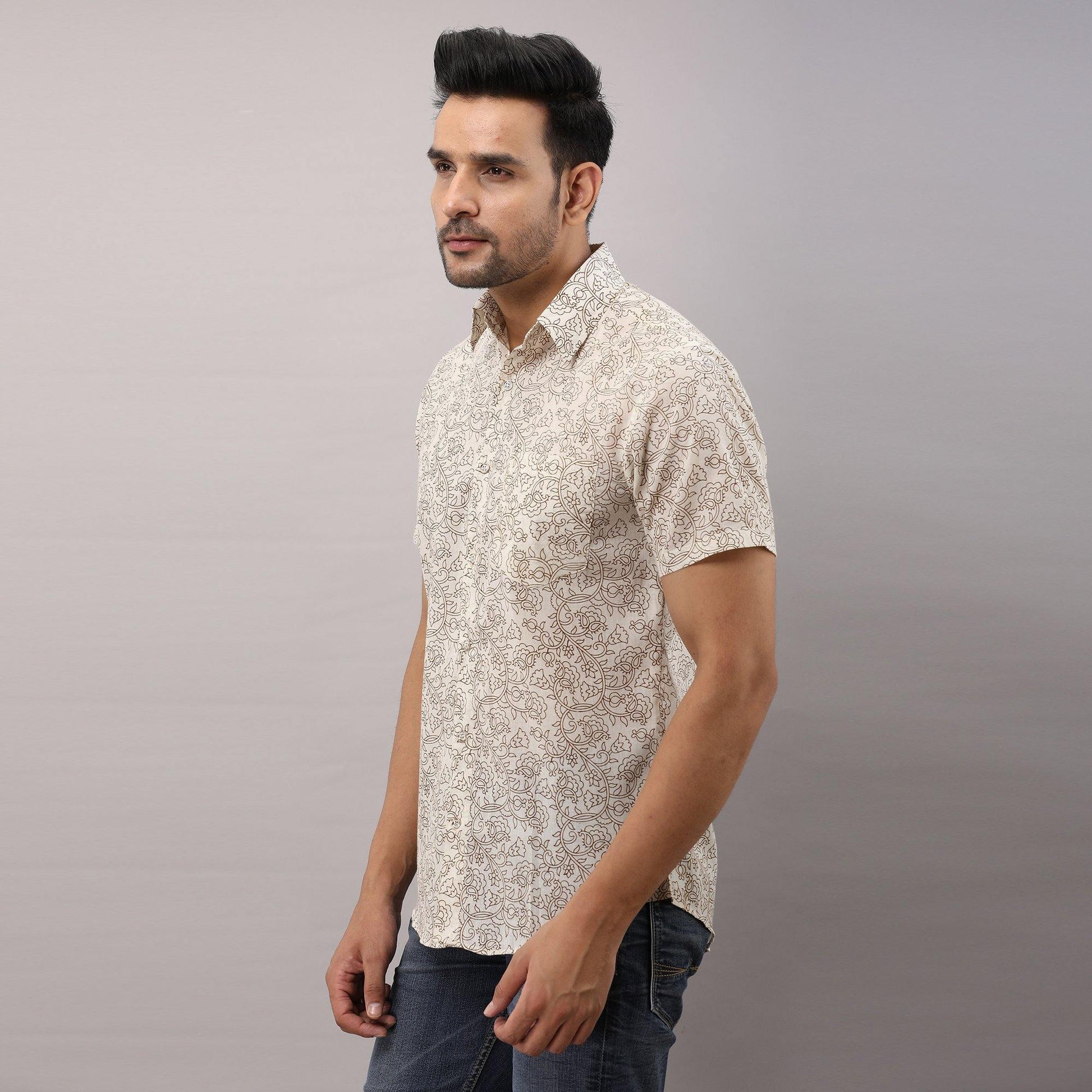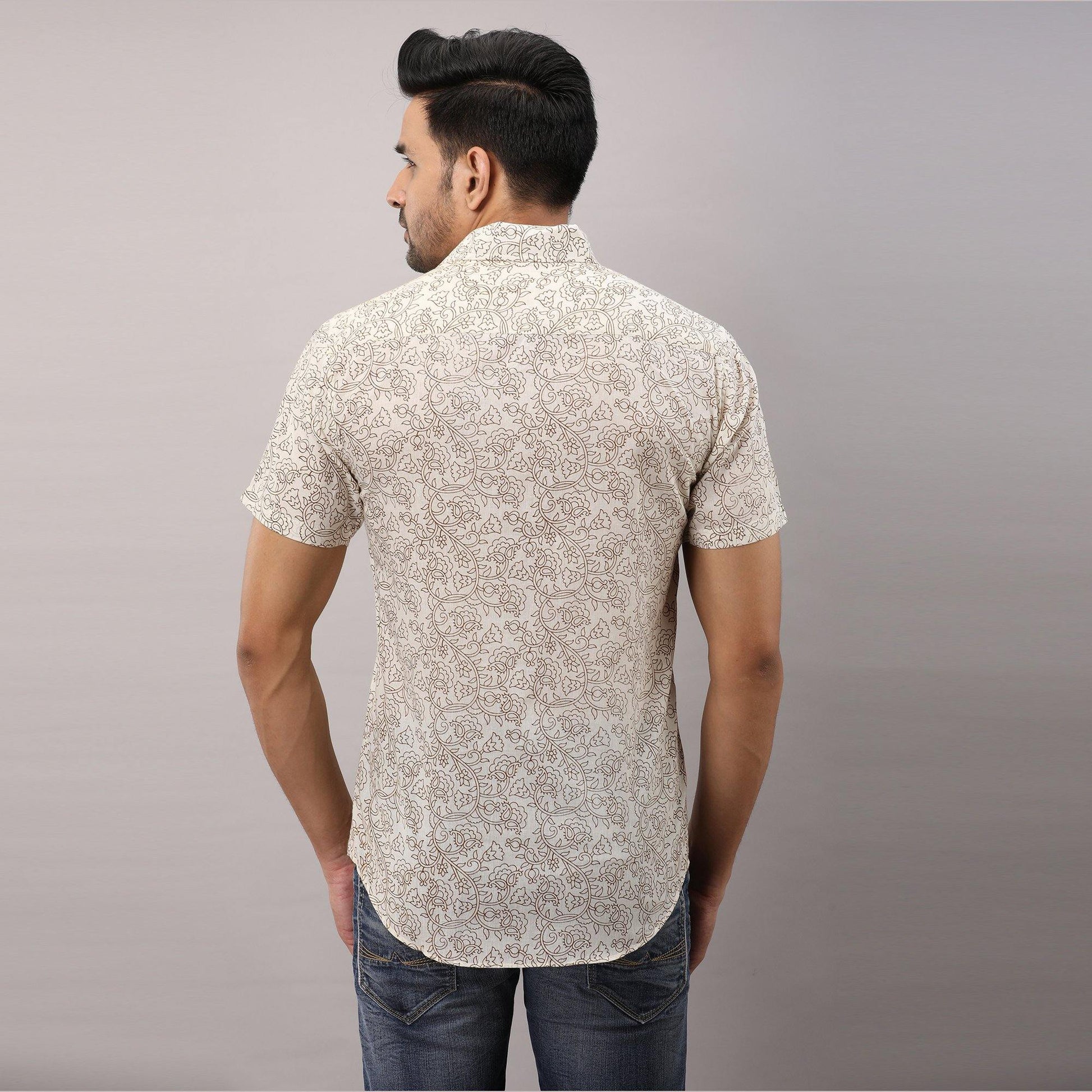This comfortable half-sleeved block printed shirt is any wearer's favorite. Crafted in breathable pure cotton, prints are made from vegetable dye, it is fashioned to create a sophisticated impression with its smart regular collar and hand block printed design.