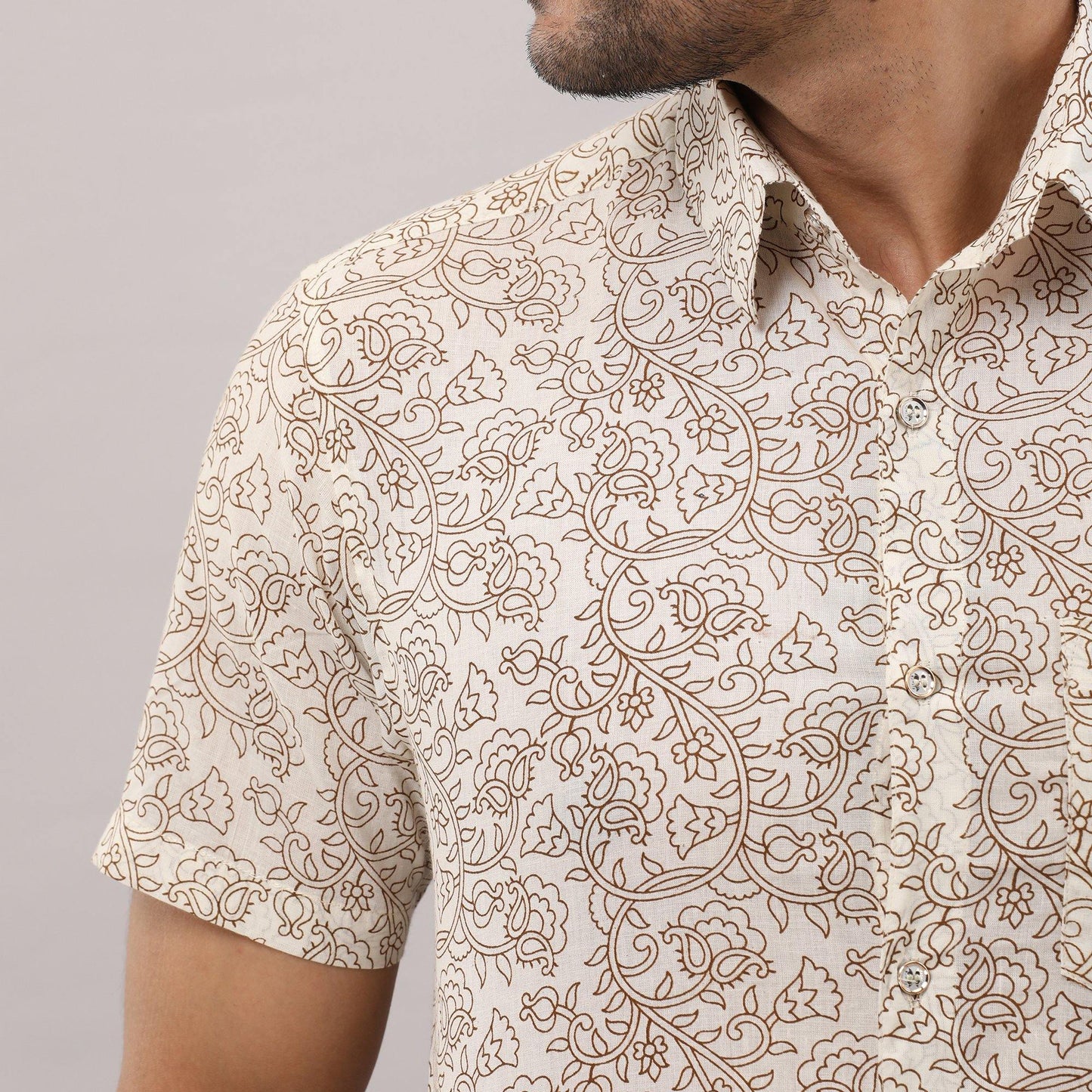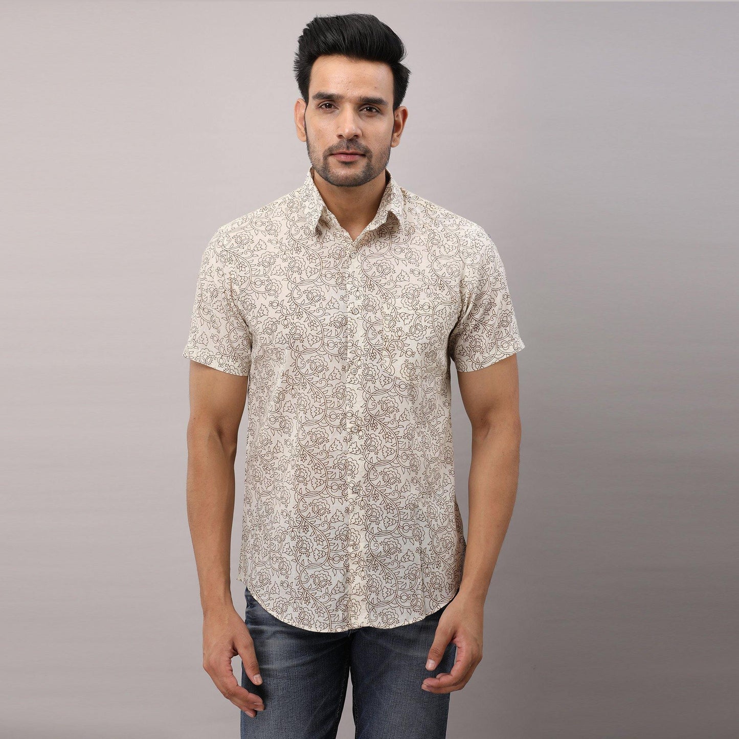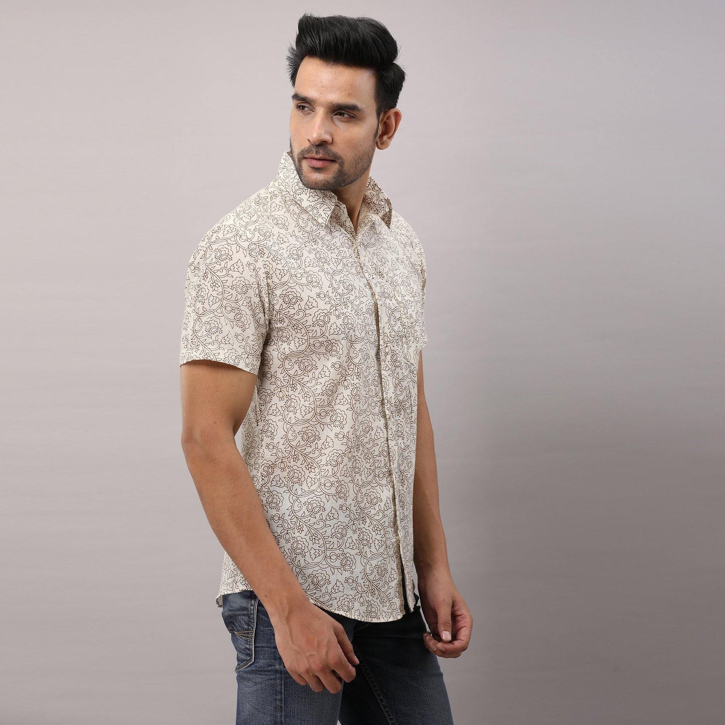 This comfortable half-sleeved block printed shirt is any wearer's favorite. Crafted in breathable pure cotton, prints are made from vegetable dye, it is fashioned to create a sophisticated impression with its smart regular collar and hand block printed design.