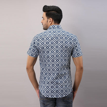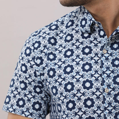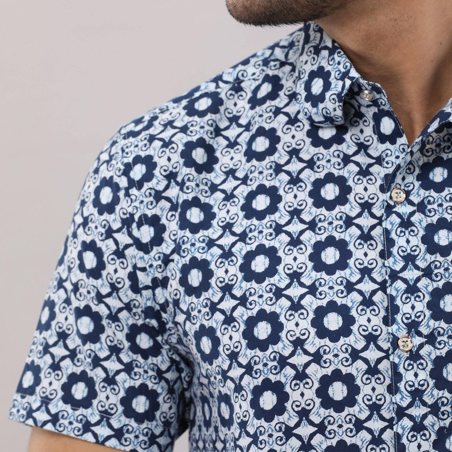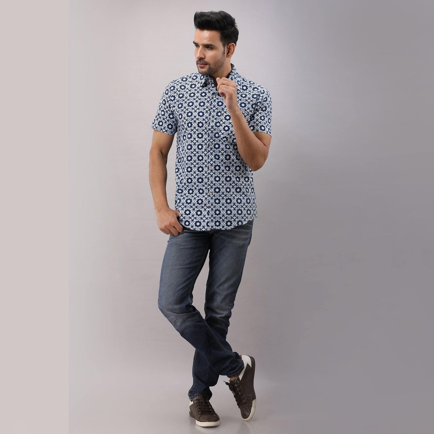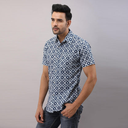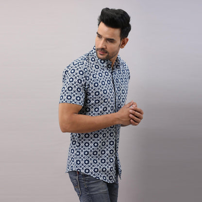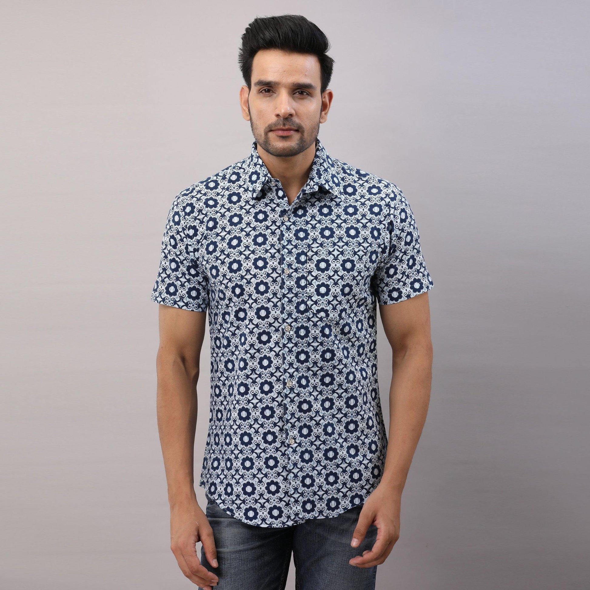 This comfortable half-sleeved block printed shirt is any wearer's favorite. Crafted in breathable pure cotton, prints are made from vegetable dye, it is fashioned to create a sophisticated impression with its smart regular collar and hand block printed design.