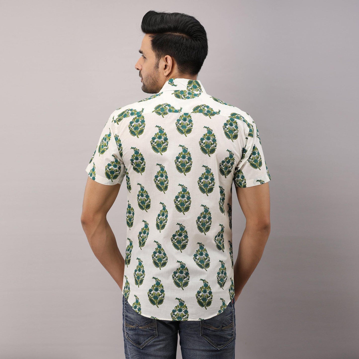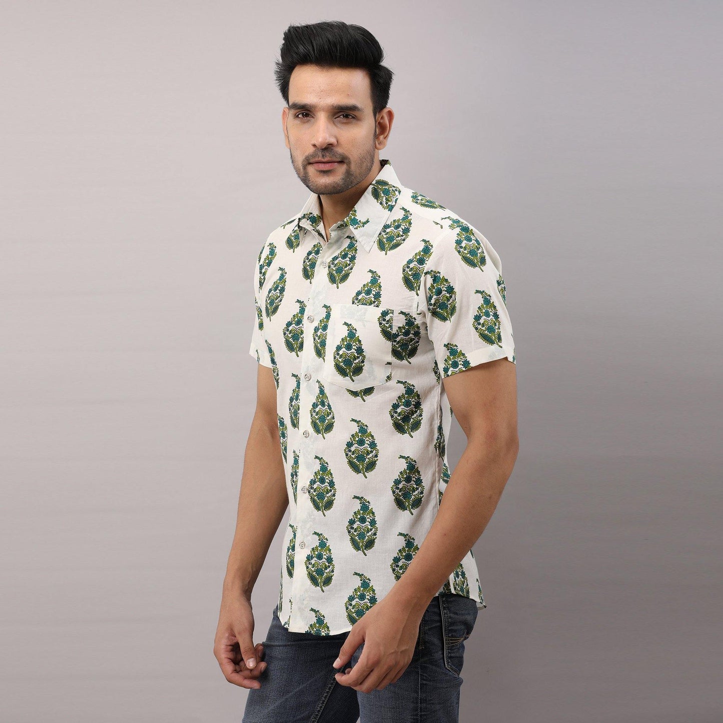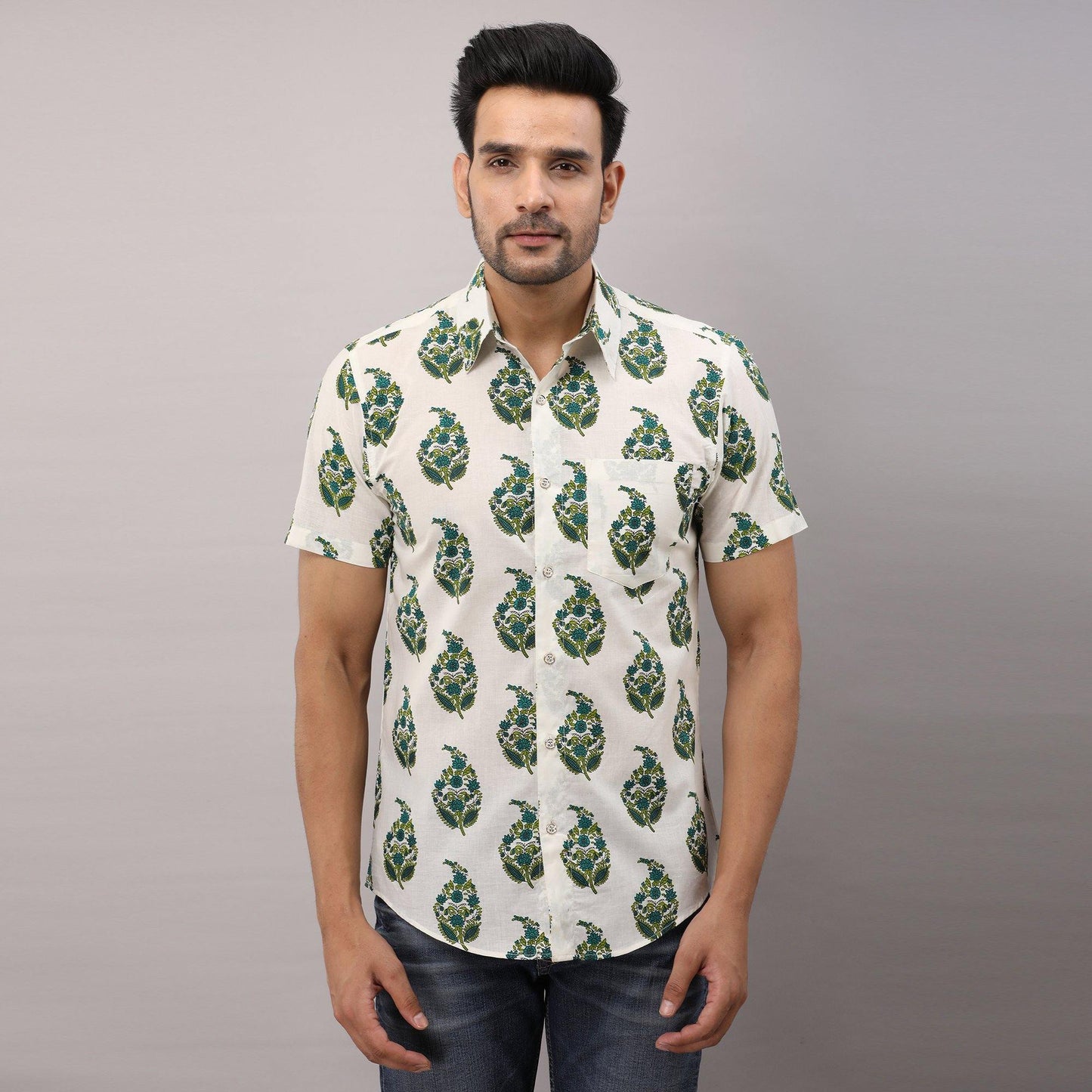 This comfortable half-sleeved block printed shirt is any wearer's favorite. Crafted in breathable pure cotton, prints are made from vegetable dye, it is fashioned to create a sophisticated impression with its smart regular collar and hand block printed design.