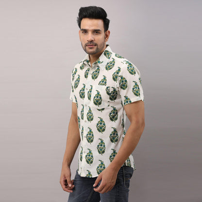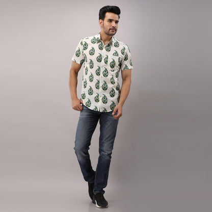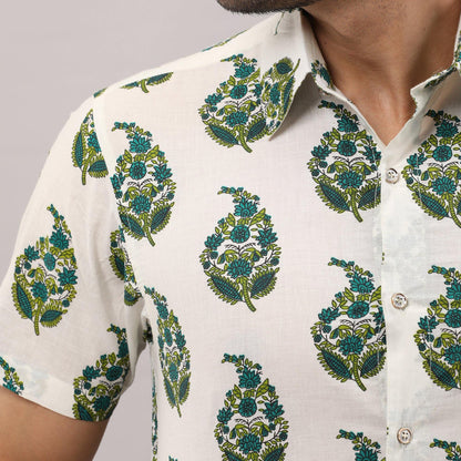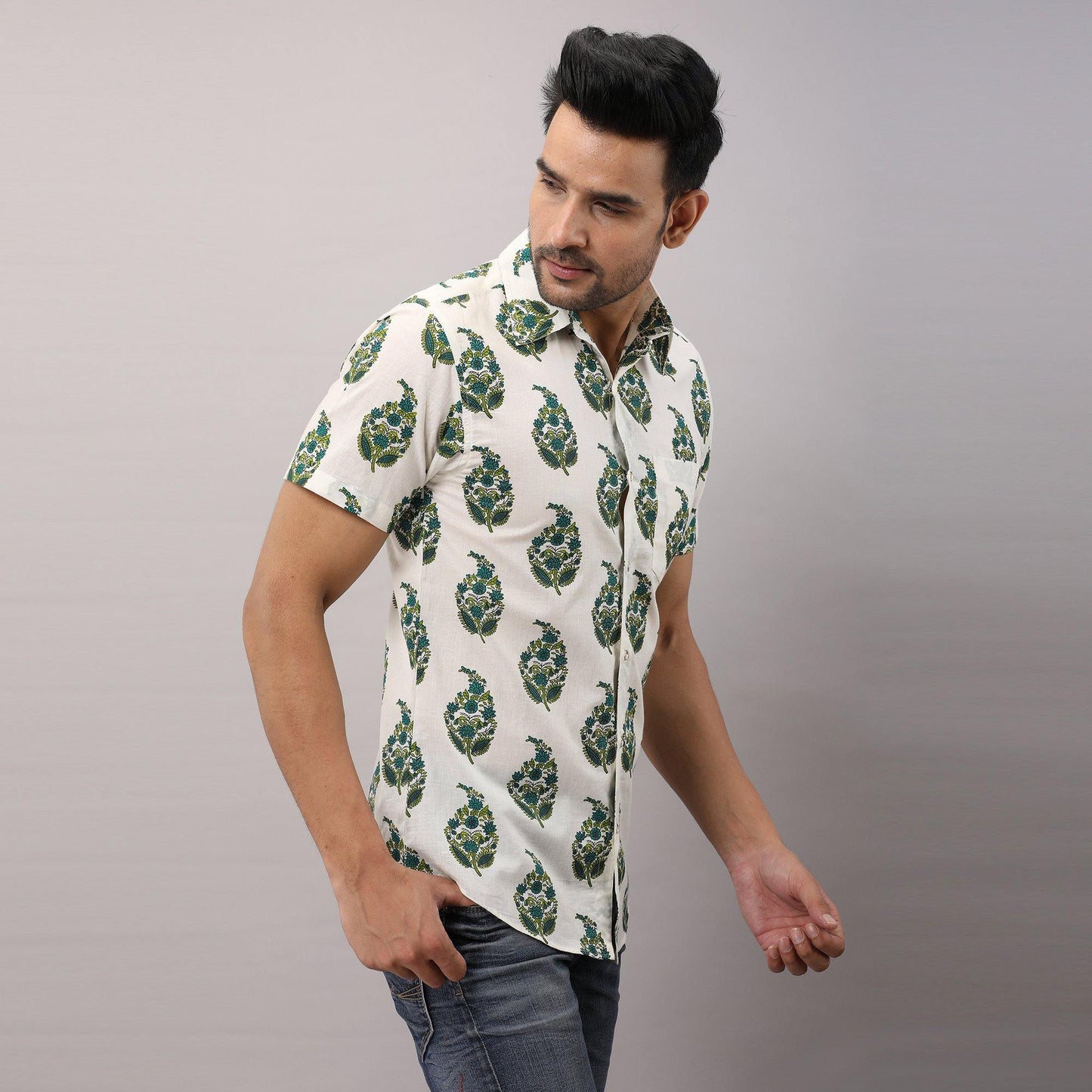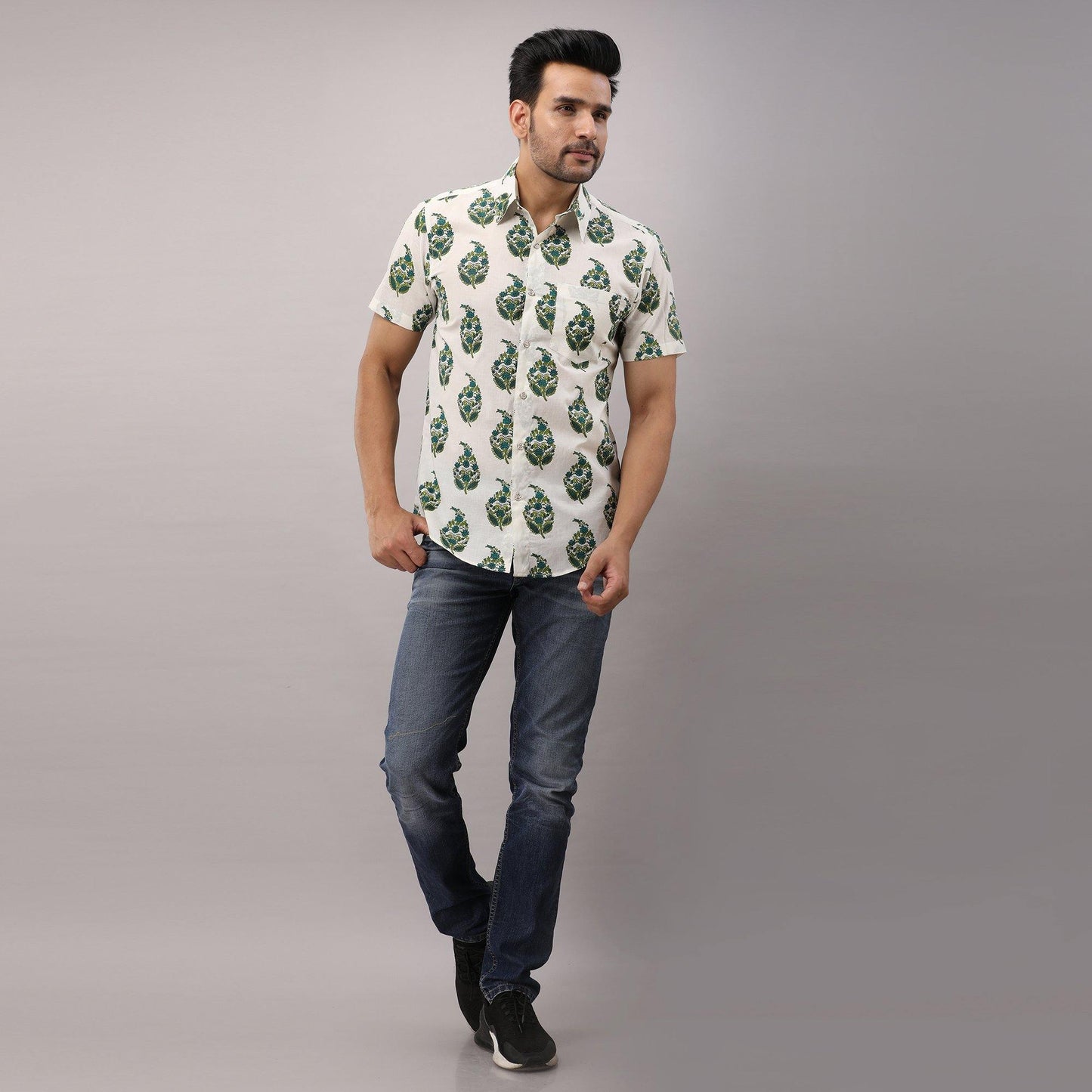 This comfortable half-sleeved block printed shirt is any wearer's favorite. Crafted in breathable pure cotton, prints are made from vegetable dye, it is fashioned to create a sophisticated impression with its smart regular collar and hand block printed design.
